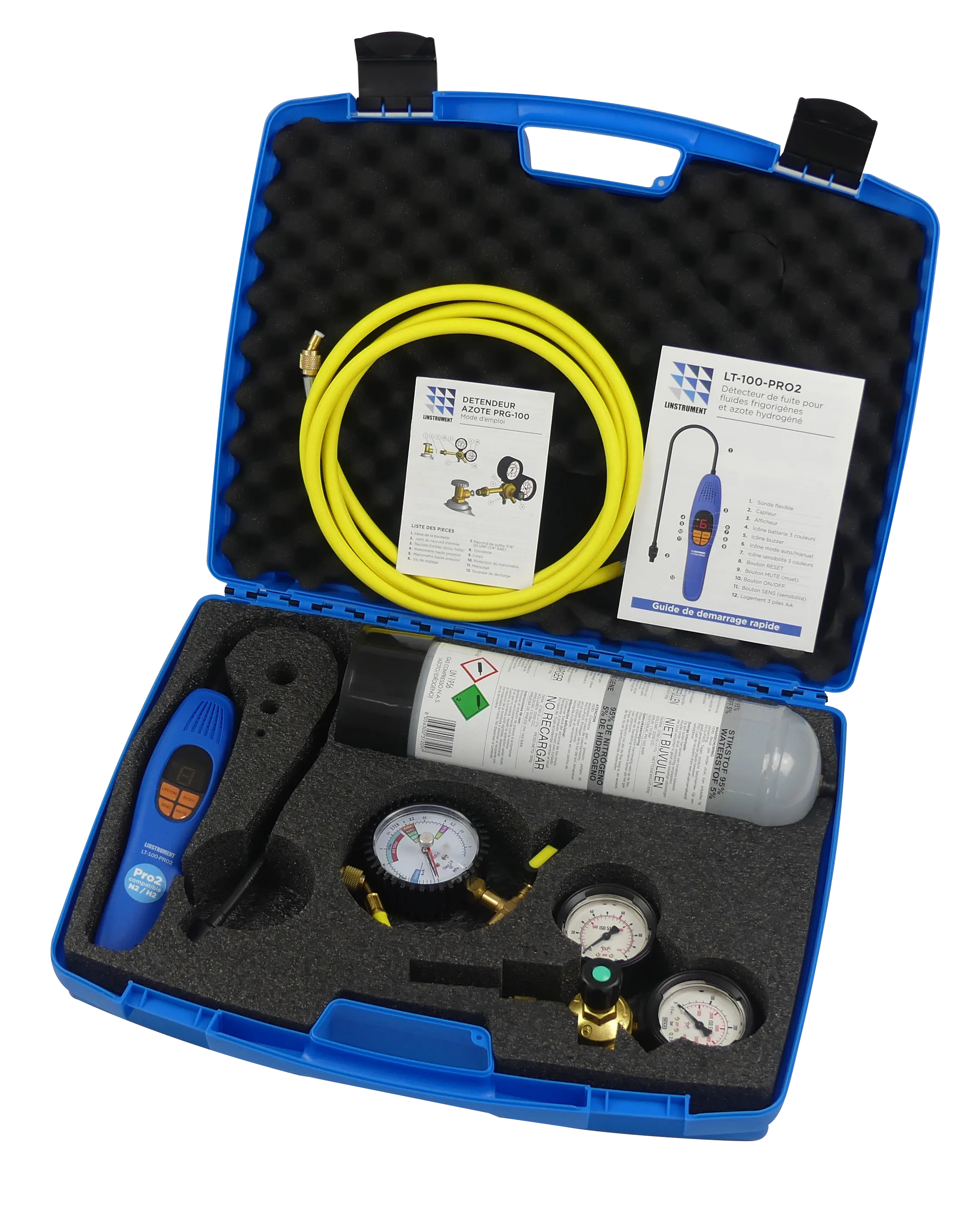 Mallette complète pour la détection de fuites tous gaz (HFC, HFO, HC) et azote hydrogéné (N2H2), avec détendeur PRG-100 compatible bouteilles azote classiques et hydrogéné.