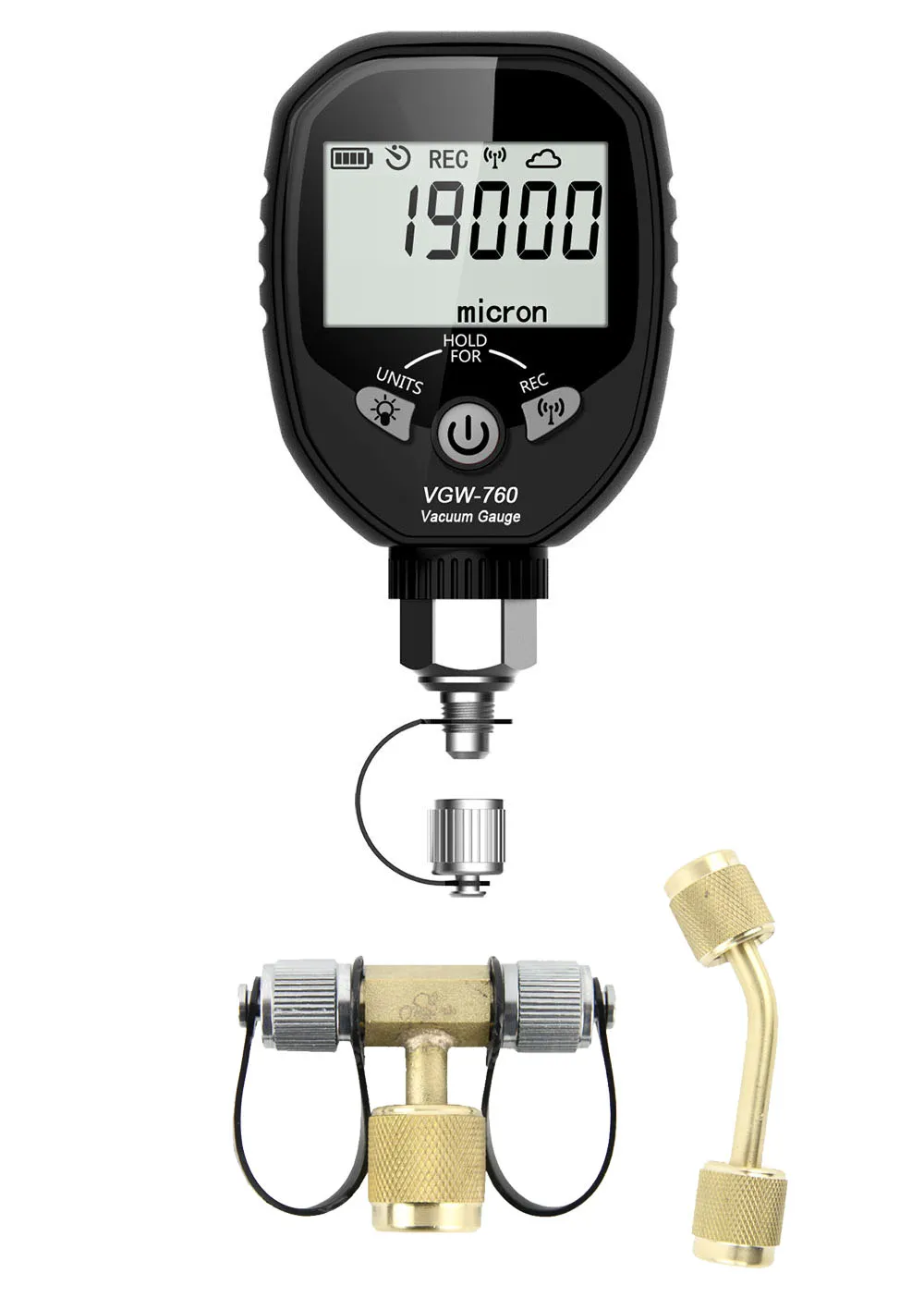 VGW-760 est un vacuomètre digital professionnel pour la mesure précise de la dépression lors du tirage au vide des installations de froid et de génie climatique. Très pratique sur chantier grâce à ses nombreux accessoires il permet la mesure précise du vide et garantit le dégazage complet de toutes les vapeurs humides et gaz incondensables hors de l'installation. VGW-760 est en outre un appareil très robuste grâce à son boîtier renforcé et son filtre à huile qui protège efficacement le capteur Pirani intégré des pollutions inhérentes à tout système CVC/R.
