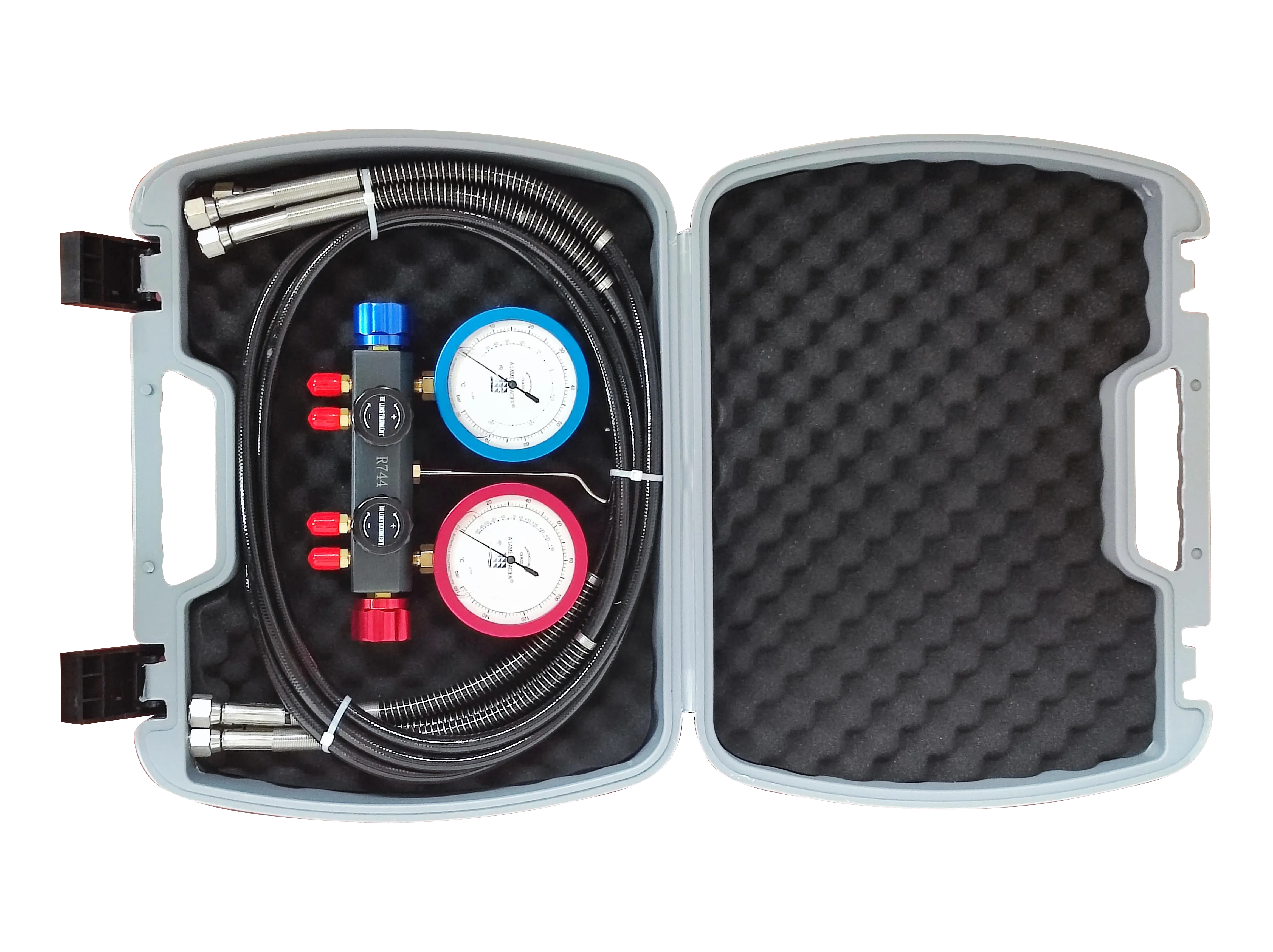 Conçu en aluminium robuste, il est équipé de manomètres Ø80 mm à bain d'huile en composites, assurant une lecture claire et précise des pressions et températures. Le système de vannes à pistons avec joints toriques garantit une étanchéité optimale. Les boutons de vanne et le corps de by-pass sont également en aluminium pour une durabilité renforcée. Il est livré avec une mallette de transport premium et un jeu de 3 flexibles CH60-CO2. Idéal pour les opérations de tirage au vide, de charge et de récupération sur les systèmes complexes nécessitant 4 voies.